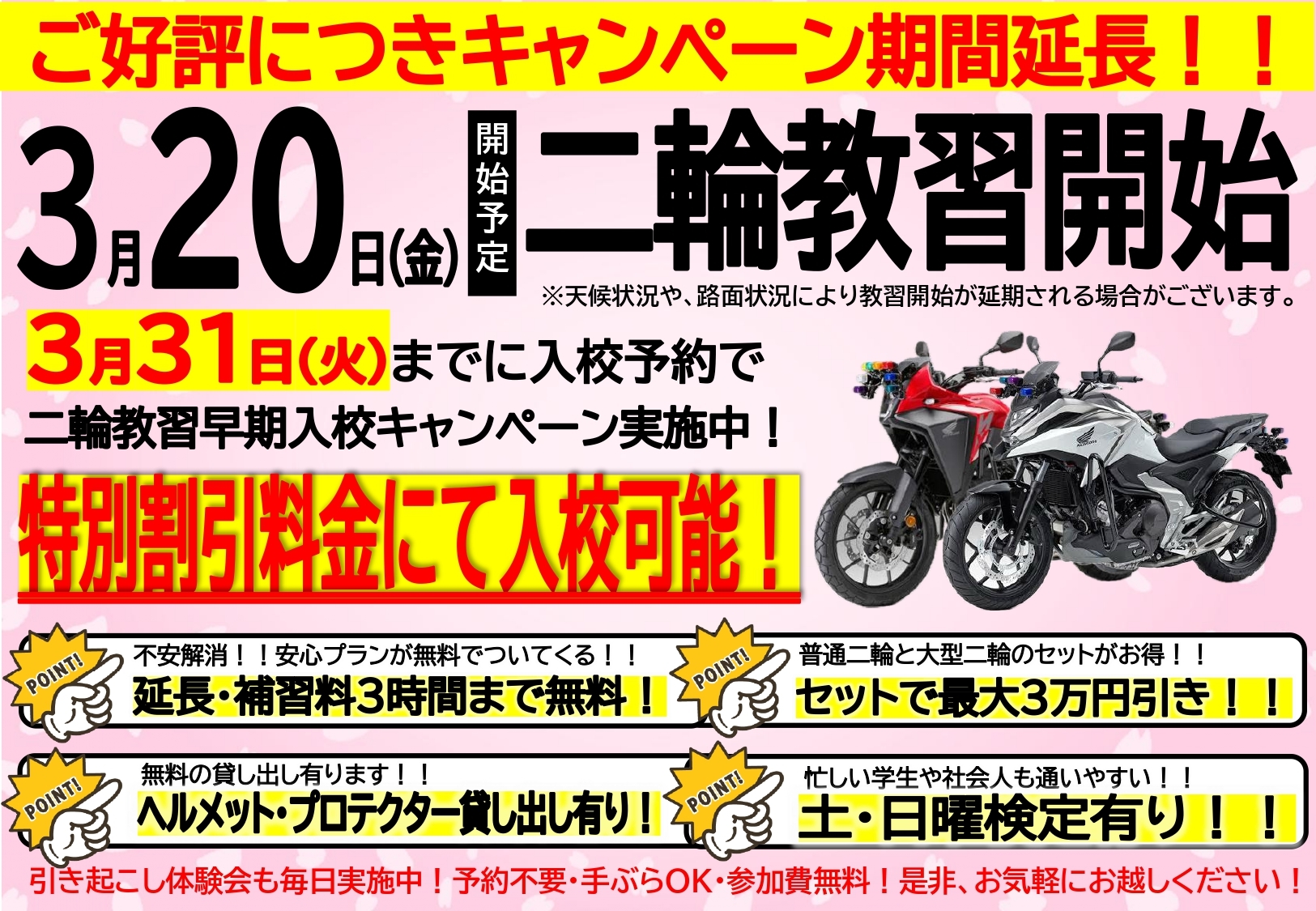 本年の二輪の教習開始は3月20日(金)を予定しております。それに伴い入校の開始を行います。3月19日(木)までの入校手続きでお得な早期割引もございますので、この機会に是非!!※天候状況や、路面状況により教習開始が延期や時間帯を限定させていただく場合がございます。何卒ご理解ご協力の程よろしくお願いいたします。